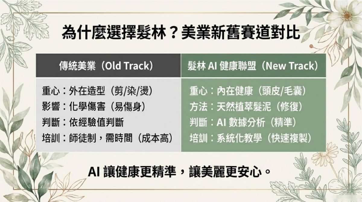 相比之下,髮林 AI 健康聯盟專注於頭皮與毛囊的內在健康,打造全方位 大健康養護方案。我們結合 天然植萃髮泥與生物活性修護因子,透過 AI數據分析與可視化報告,精準掌握頭皮與髮質狀態,提供安全、科學且專屬的養護方案。