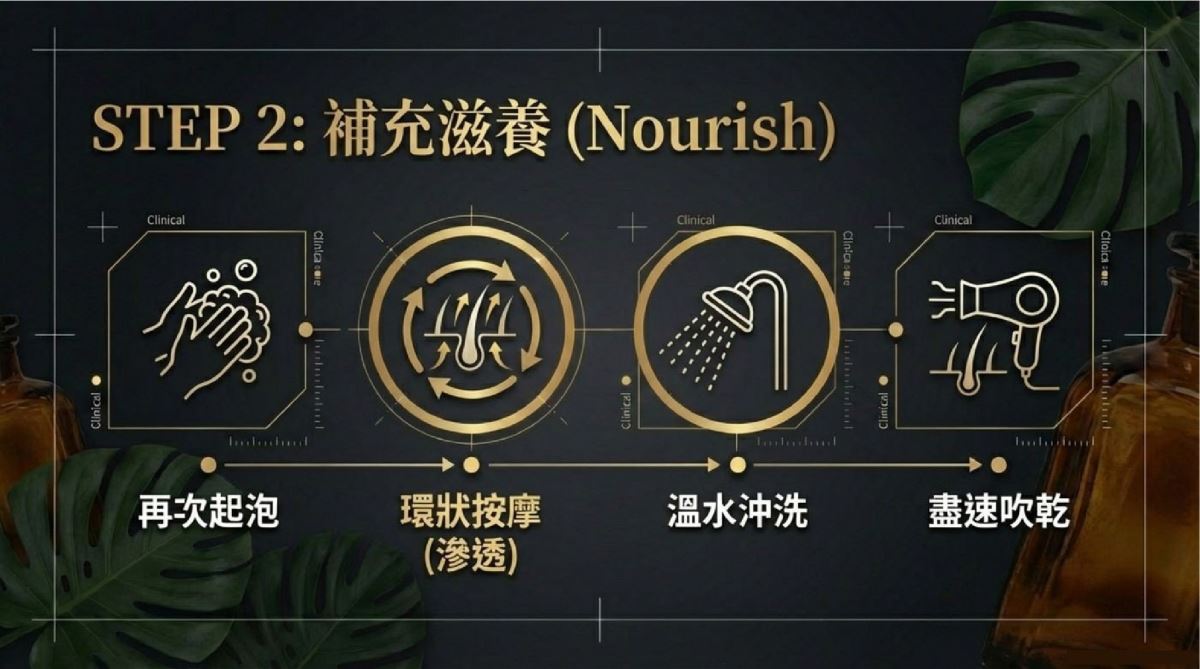 - 逆向按摩髮根(關鍵步驟,促進血液循環與清潔)